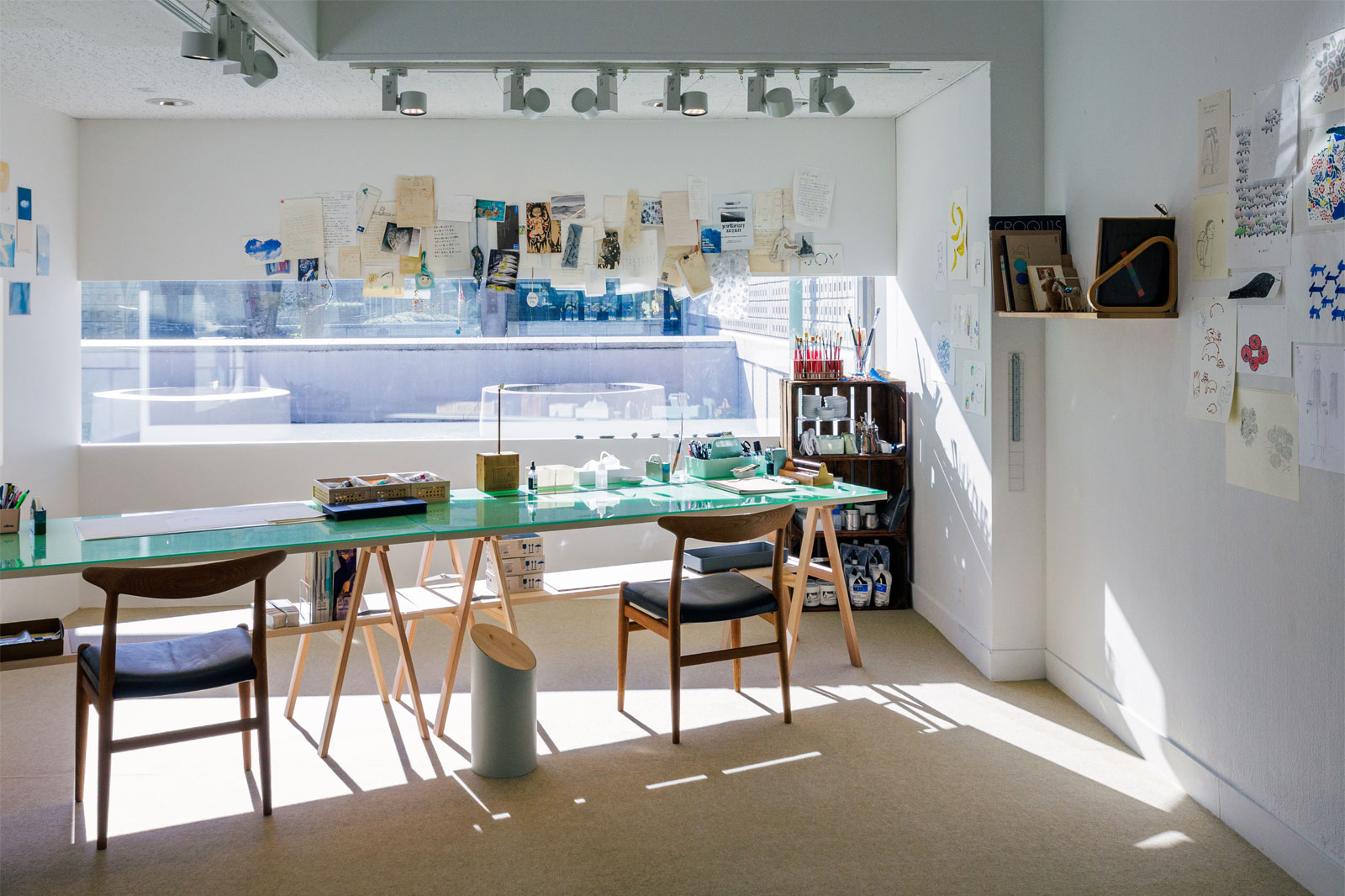 ミナ ペルホネンのアトリエを再現した「humming(ハミング)」エリアにて、皆川 明と田中景子が実際に机に向かい、創作活動を行います。